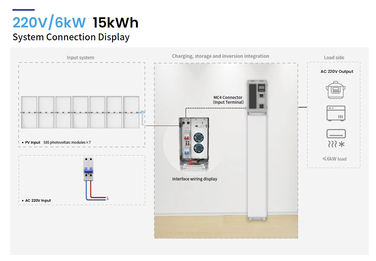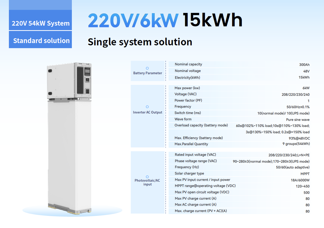 Mit einer Ausgangsleistung von 6 kW, einem integrierten 15 kWh Lithium-Batteriespeicher (48V / 300 Ah) sowie modernem MPPT-Laderegler verwandelt sie Solarenergie effizient in nutzbaren Haushaltsstrom – zuverlässig bei Tag und Nacht.