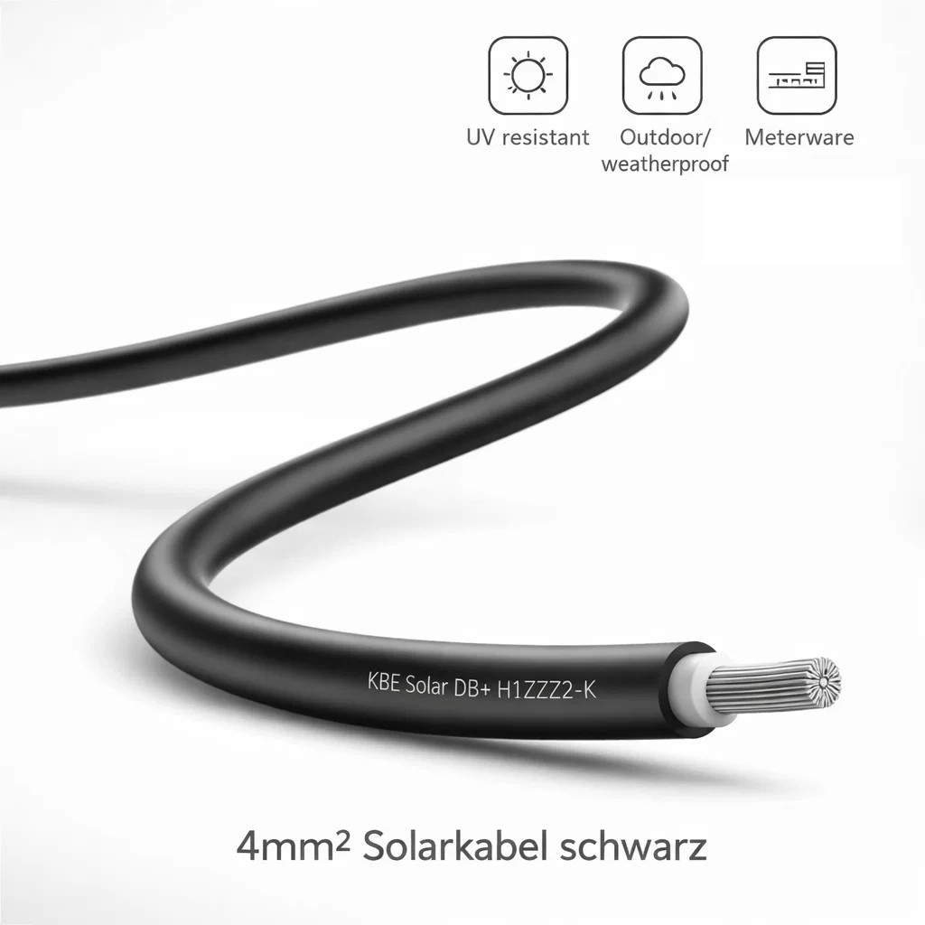 Das 4mm² Solarkabel schwarz KBE Solar DB+ eignet sich ideal zur Verbindung von Solarmodulen mit Mikrowechselrichtern sowie für den Einsatz in Balkonkraftwerken. Auch in kleineren bis mittleren Photovoltaikanlagen sorgt es für eine sichere und stabile Energieübertragung im DC-Bereich.