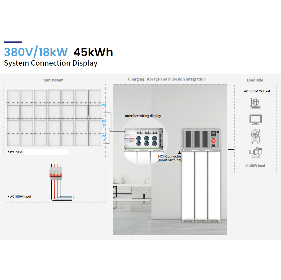 Die autarke 45 kWh Inselanlage 18kW von smartPower® ist eine leistungsstarke dreiphasige Komplettlösung für Industrie, Gewerbe, Landwirtschaft und anspruchsvolle Off-Grid-Anwendungen. Das System kombiniert 45 kWh LiFePO₄-Speicher, einen 18 kW 3-Phasen-Wechselrichter sowie drei MPPT-Tracker und liefert gleichzeitig 380V Drehstrom und 220–230V Haushaltsstrom.